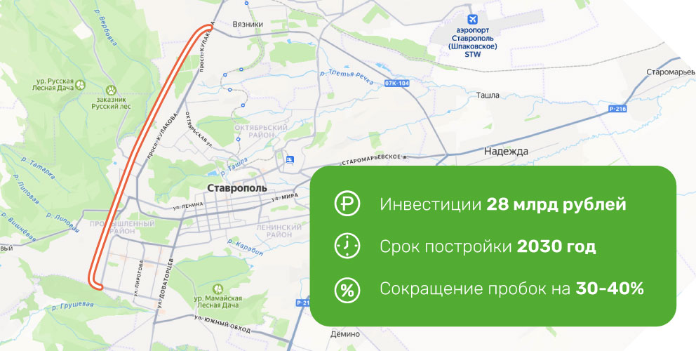 Власти разработали проект нового участка, который замкнет транспортное кольцо вокруг Ставрополя, сообщил глава региона на пресс-конференции 13 января 2026 года. По его словам, новая дорога протяженностью 18 километров пройдет по кромке «Русского леса» и не нанесет ему вреда. Трассу проложат от кольцевой развязки на Северном обходе до транспортного круга на улице 45-я параллель.