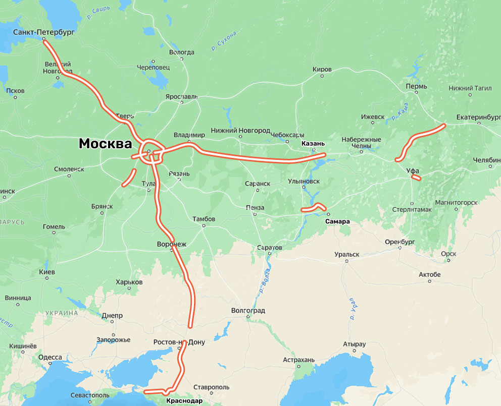 Платные трассы охватывают ключевые регионы страны: Москву и Московскую область, Санкт-Петербург и Ленинградскую область, Псковскую область, Воронеж, Ростов-на-Дону, Краснодарский край, Свердловскую область, а также республики Татарстан и Башкортостан.