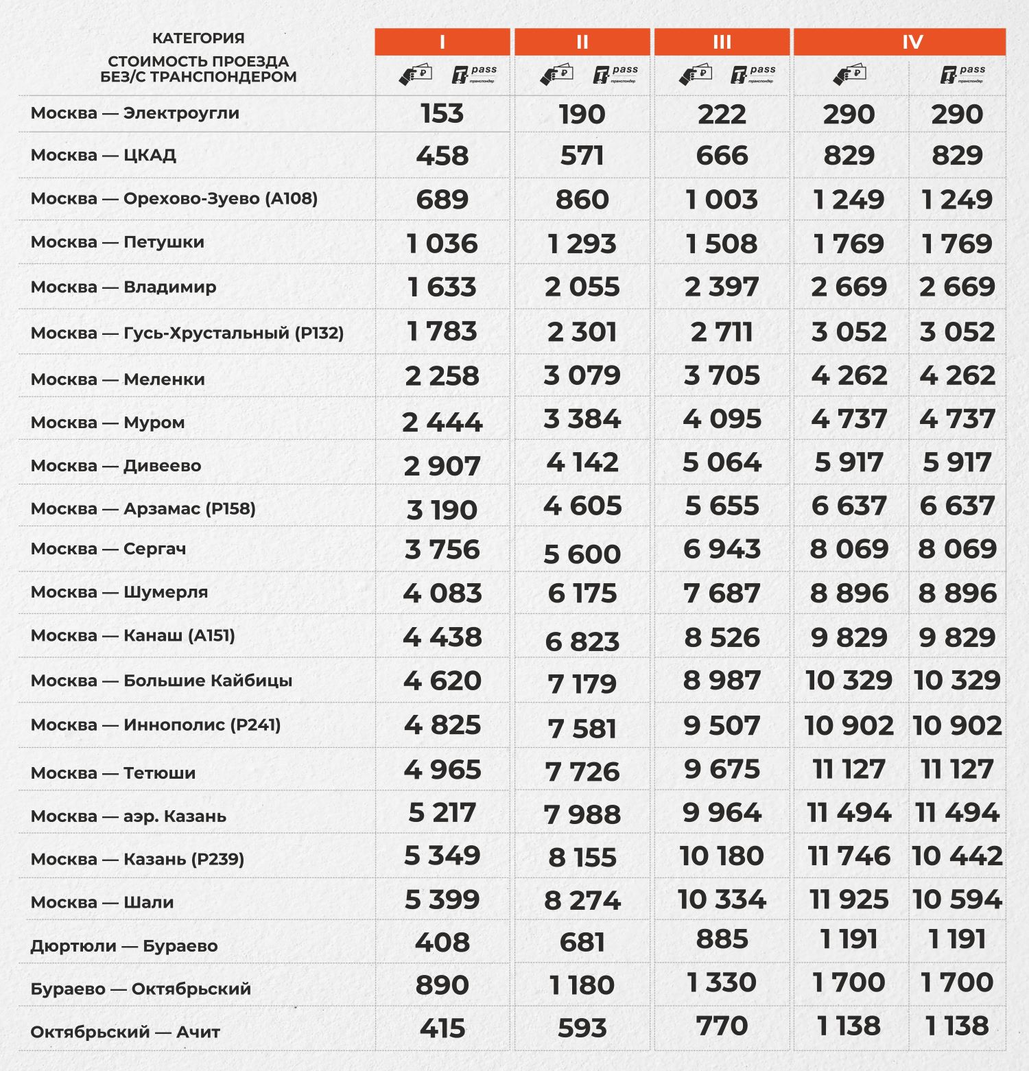 Все тарифы на проезд по трассе М-12 от Москвы до Ачита указаны в таблице ниже (источник - официальный сайт «Автодора»).
