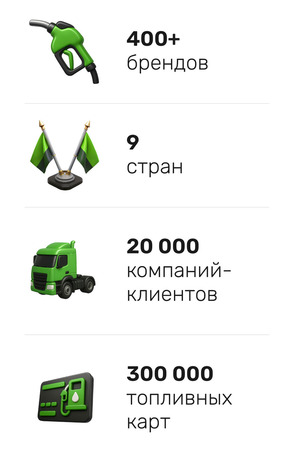 Всего по топливной карте доступно более 21 тысячи точек обслуживания в 9 странах мира: России, Беларуси, Казахстане, Армении, Грузии, Азербайджане, Таджикистане, Киргизии, Турции.